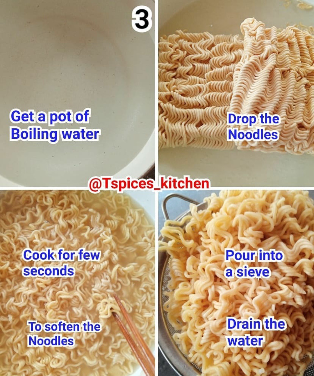 Get a pot of boiling water and add the noodles. Cook it for some seconds to help soften the noodles. Pour it into a seive to help in drainage of the water.
