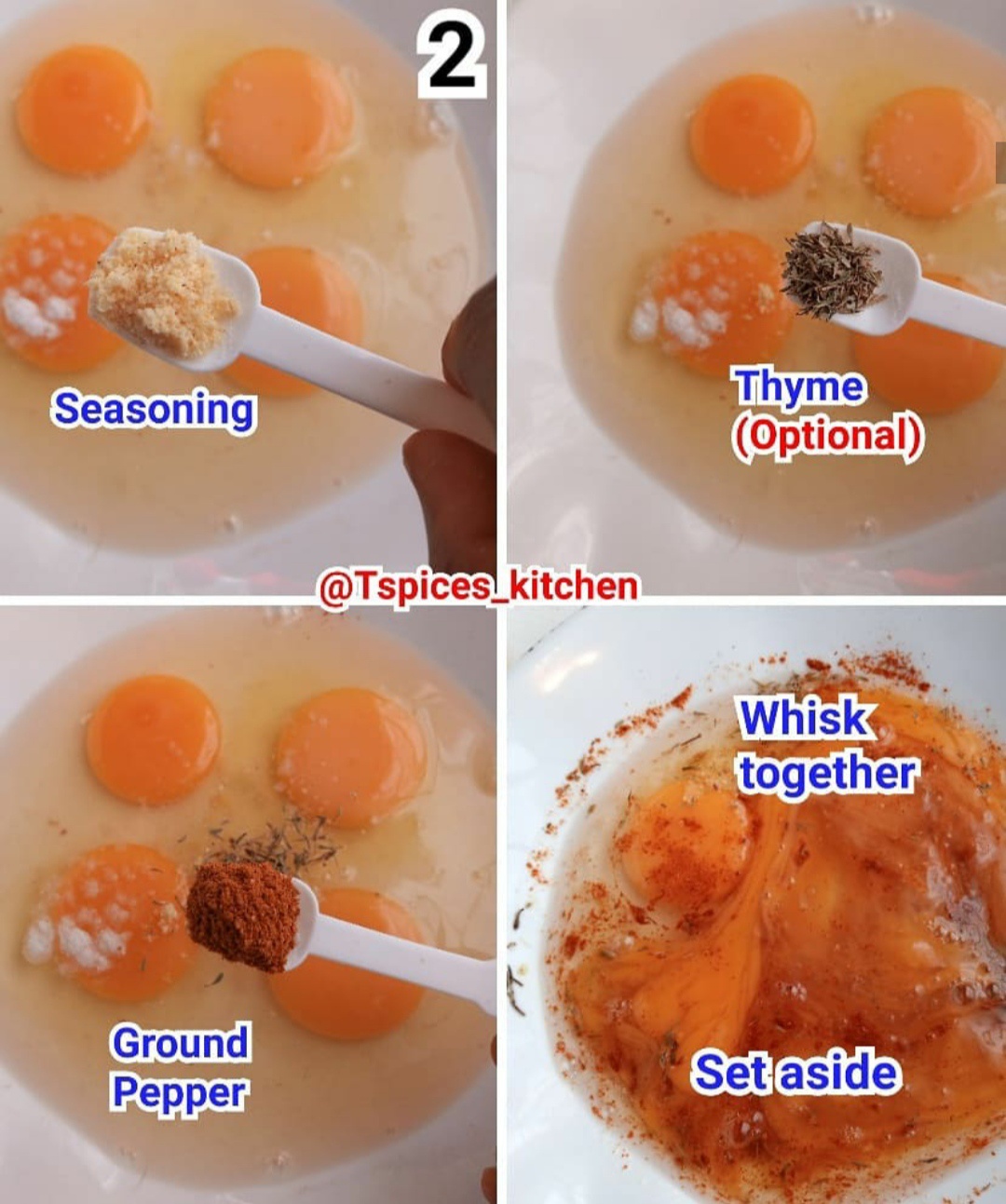 Then add seasoning, Thyme is optional but add it if it's available. Also add the ground pepper and whisk together. Set aside.