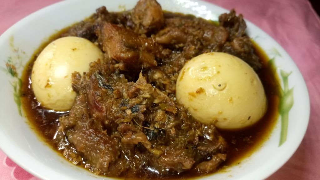 11. Add the boiled eggs, stir and taste for salt and adjust if need be, then put off heat; Ayamase stew is ready.