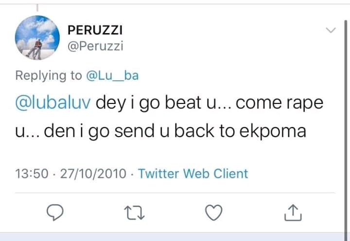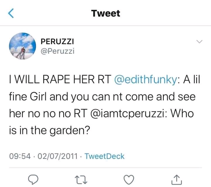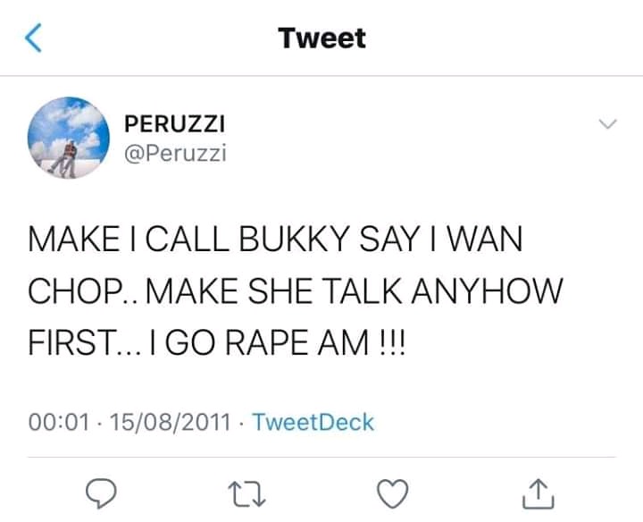 However, certain Nigerians went digging into Peruzzi's past on Twitter and discovered his old tweets 9 years ago in which he made jokes about rape and clearly called himself a rapist. In most of his tweets he insinuated that he will have his way with any woman and any woman who dresses in a certain way or comes to a club will be raped by him.