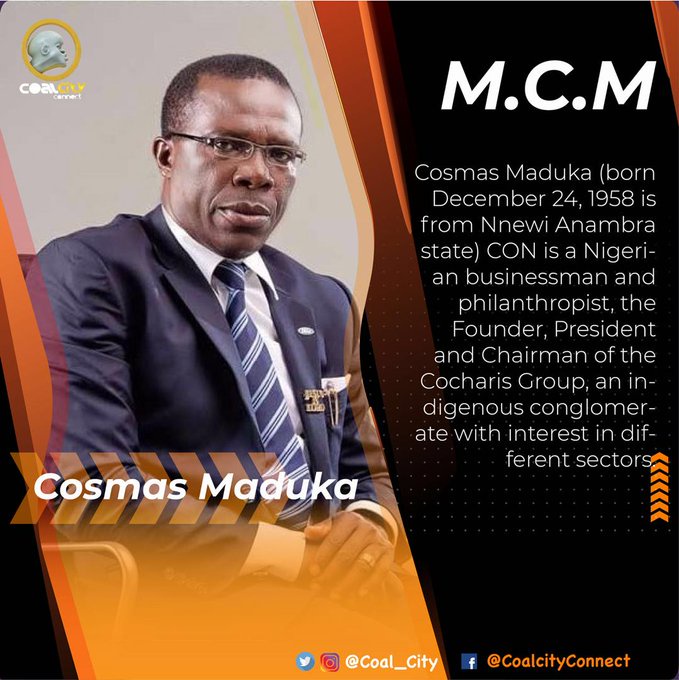 Cosmas Maduka, born December 24, 1958, CON is a Nigerian businessman and philanthropist, the Founder, President and Chairman of the Coscharis Group, an indigenous conglomerate with diverse interest in Manufacturing, ICT, Petrochemical, Auto care and Auto Components, Automobile Sales and Services, Agric and Agro Allied business sectors. Maduka is famous for Coscharis Motors, a leading automobile sales and servicing company. In addition to other brands of cars such as Range Rover, Ford and Jaguar; he is sole distributor of BMW in Nigeria.