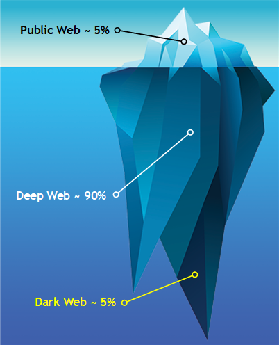 The deep web can be imagined as an iceberg on an ocean surface, the part of the web that is easily accessible and visible to us which is referred to as the surface web is the tip of the iceberg that can clearly be seen on the surface and the deep web is the largest part of the iceberg that is hidden underwater and the Dark web makes up part of the deep at the end of the iceberg (picture below)