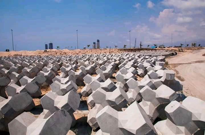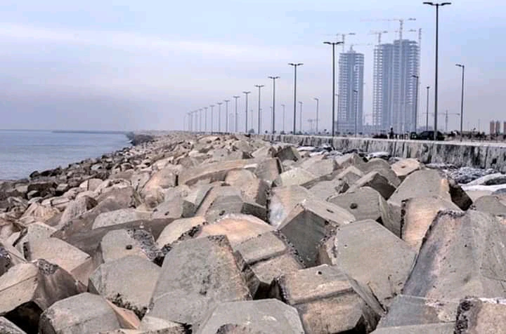 Being a coastal city, it is therefore prone to coastal erosion. For this reason, the "Great Wall Of Lagos" is being put in place. The wall is a strong interlock of Accropodes, carefully placed by the coast of the city. As of today, the sea wall has reached a total length of 6.5km of the planned 8.5km