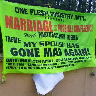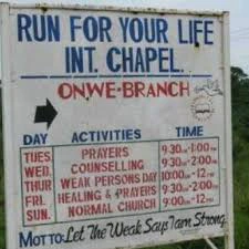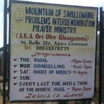 "Mountain of swallowing problems?" There is no end to the outrageous names people give their churches in Nigeria these days. For instance; High Tension Ministry, Devil go hear am Jesus Ministry, Chukwudi & Son evangelical ministry, Aba, Holy Ghost on Fire Ministry, Abuja, Jesus the Landlord, We the Relaxing Pew ministry, Port-Harcourt… please someone stop me.