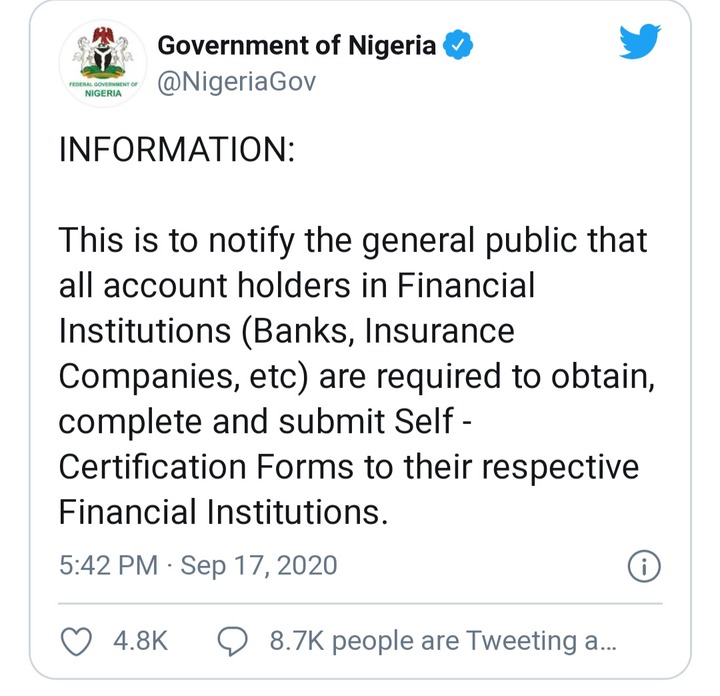 This information was shared via the verified Twitter account of the Government of Nigeria, explaining that the forms are required by the relevant financial institutions to do due diligence procedures in line with the Income Tax Regulations 2019.